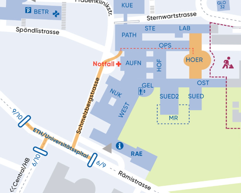 Tramlinien 6, 9, 10 bis Haltestelle ETH / Universitätsspital.
